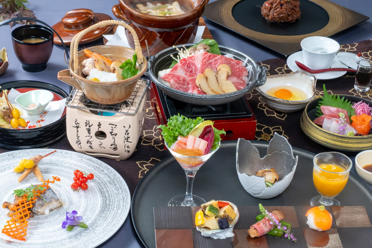 信州食材をふんだんに使用した、和洋折衷の創作オリジナル会席膳をご用意しております。2025年、お食事会場を一新。新たに設けられたオープンキッチンでは、料理人が腕をふるう様子を目の前でご覧いただけます。